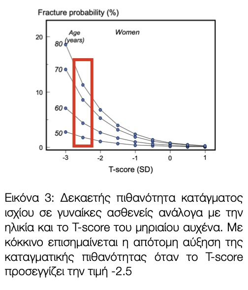 Γιατί όμως επιλέγονται αυτές οι τιμές της οστικής πυκνότητας από την ιατρική κοινότητα για τον χαρακτηρισμό των ασθενών (οστεοπενία ή οστεοπόρωση); Η απάντηση απεικονίζεται στο ακόλουθο διάγραμμα (εικόνα 3).